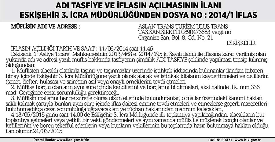 ADI TASFİYE VE İFLASIN AÇILMASININ İLANI