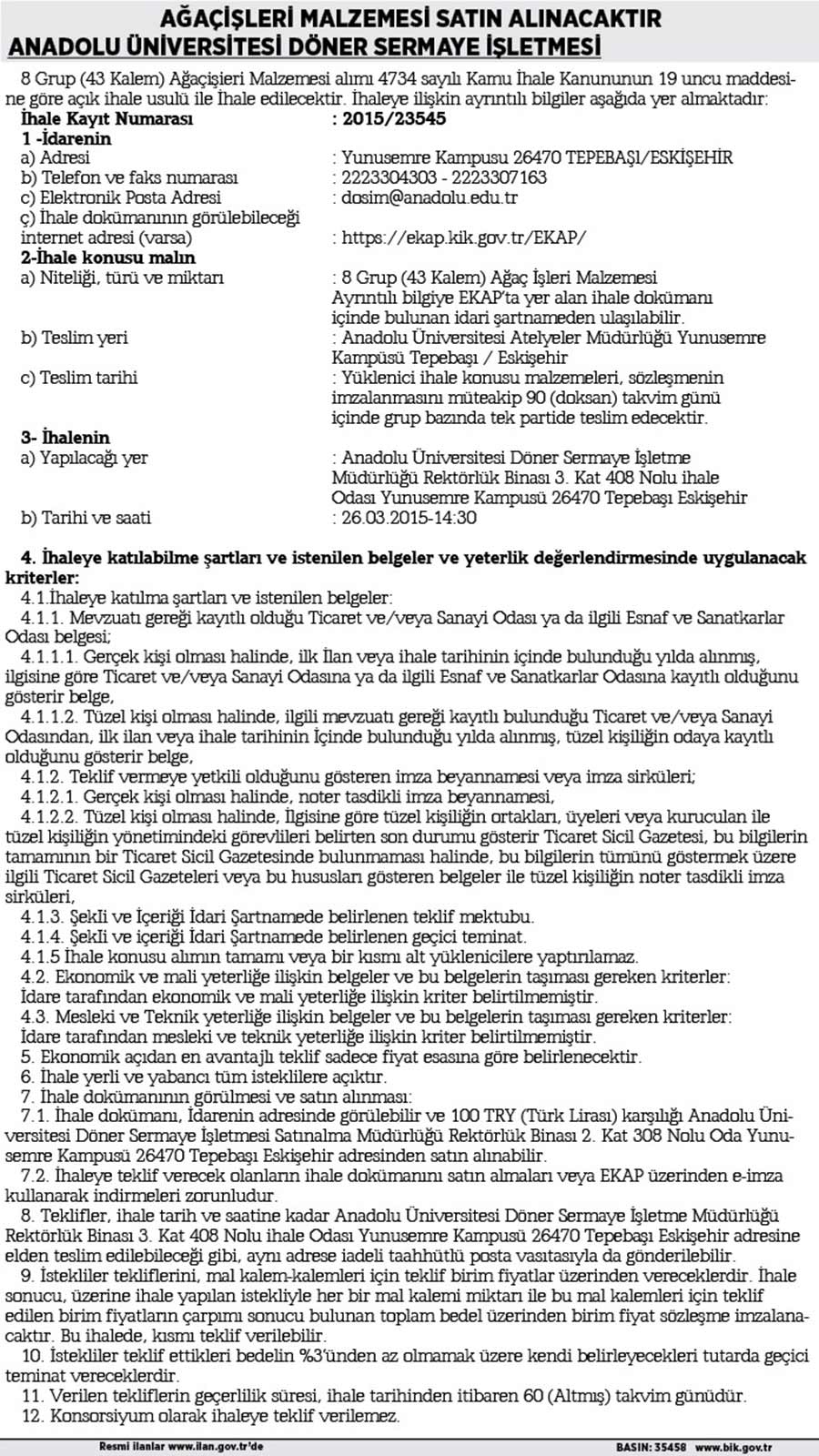 AĞAÇİŞLERİ MALZEMESİ SATIN ALINACAKTIR