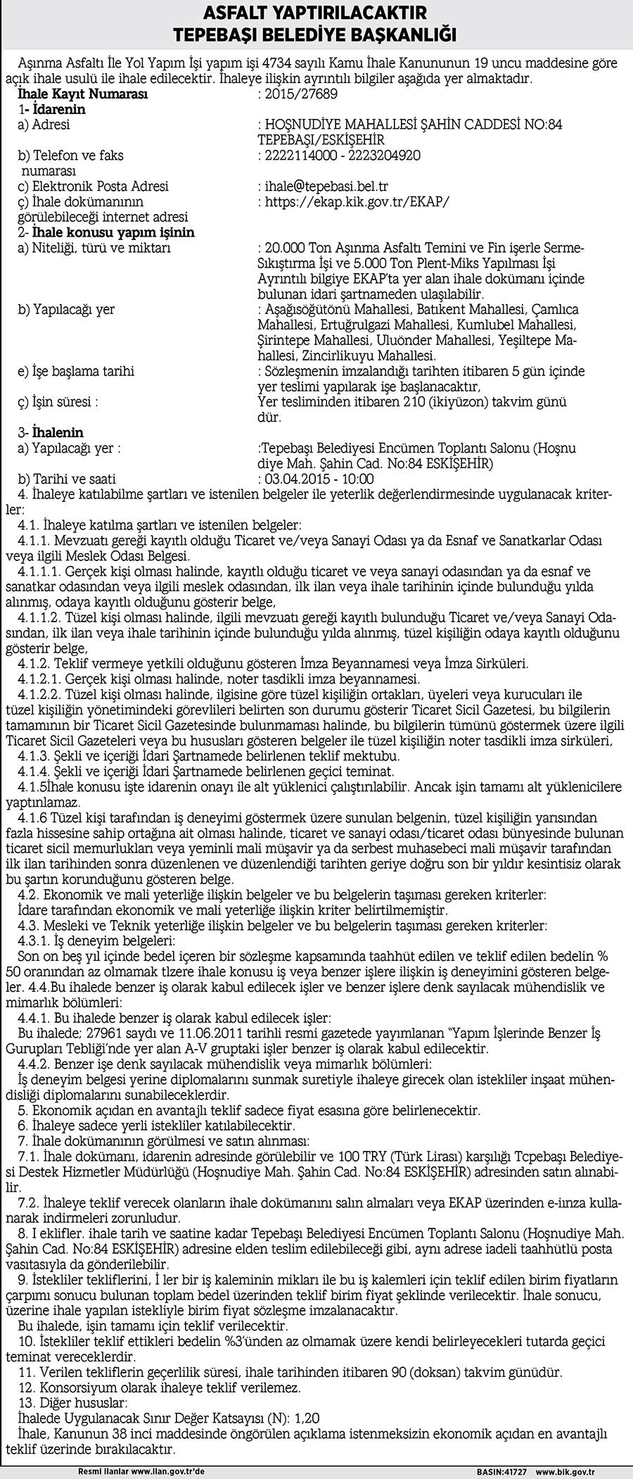 ASFALT YAPTIRILACAKTIR TEPEBAŞI BELEDİYE BAŞKANLIĞI
