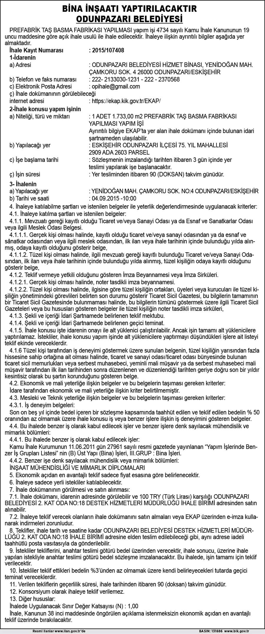 BİNA İNŞAATI YAPTIRILACAKTIR ODUNPAZARI BELEDİYESİ