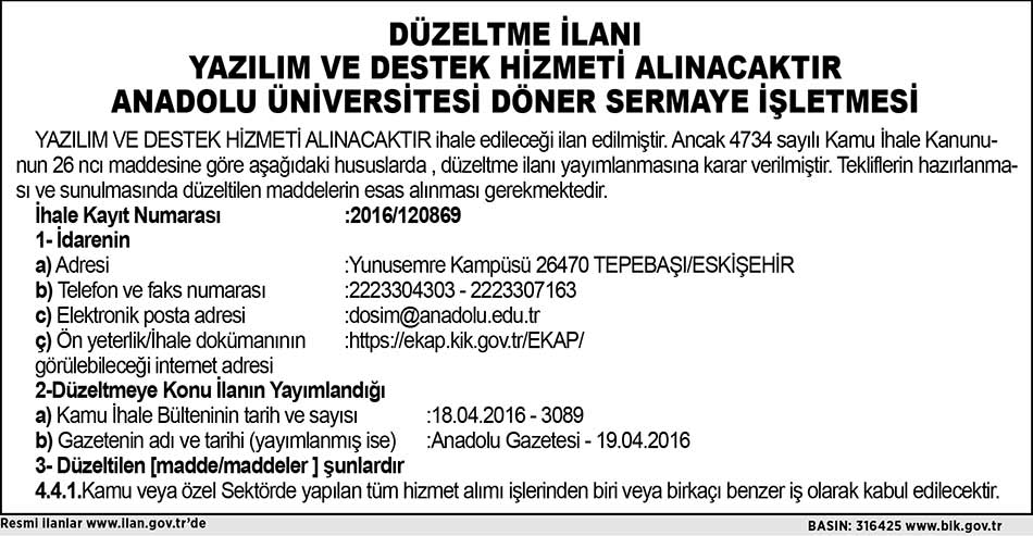 DÜZELTME İLANI - YAZILIM VE DESTEK HİZMETİ...