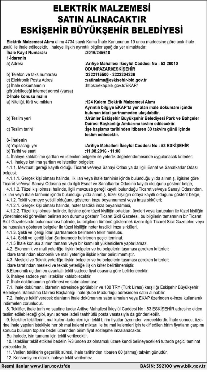 ELEKTRİK MALZEMESİ SATIN ALINACAKTIR