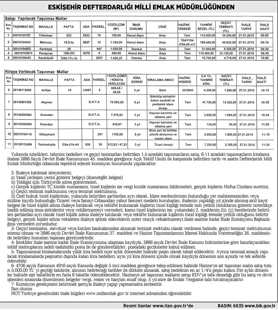 ESKİŞEHİR DEFTERDARLIĞI MİLLİ EMLAK MÜDÜRLÜĞÜNDEN