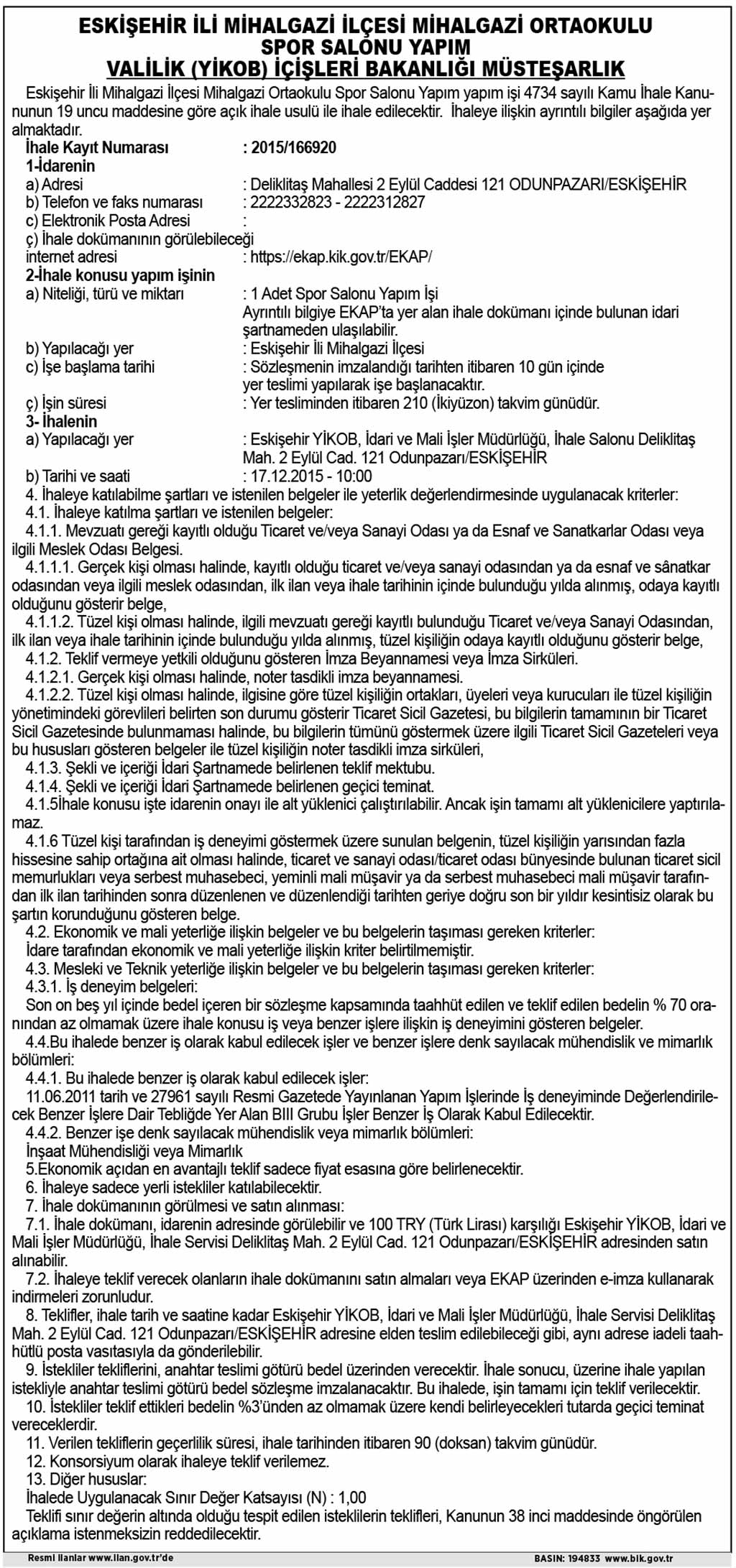 ESKİŞEHİR İLİ MİHALGAZİ İLÇESİ ORTAOKULU SPOR SALON YAPIMI