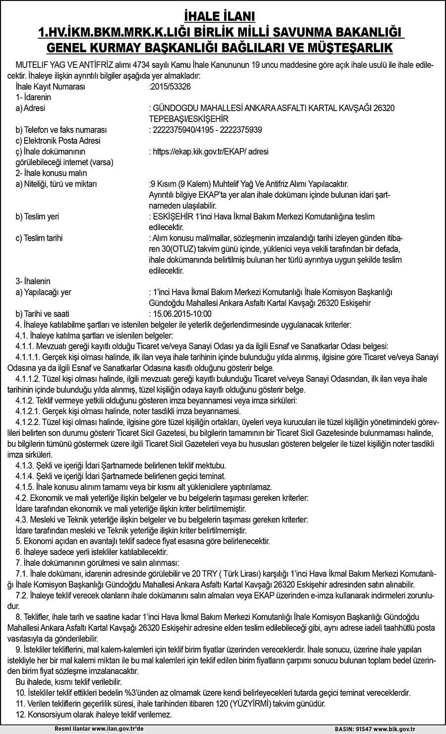 İHALE İLANI - 1.HV.İKM.BKM.MRK.K.LIĞI BİRLİK MİLLİ SAVUNMA BAKANLIĞI