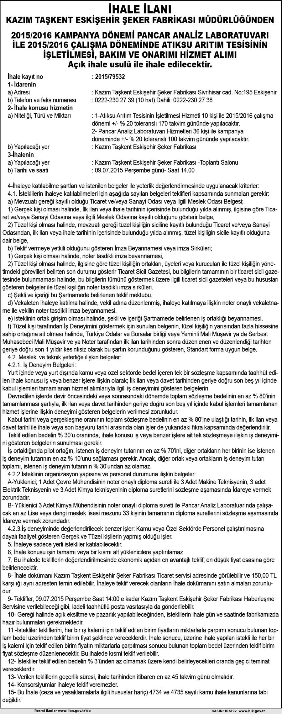İHALE İLANI - KAZIM TAŞKENT ESKİŞEHİR ŞEKER FABRİKASI...