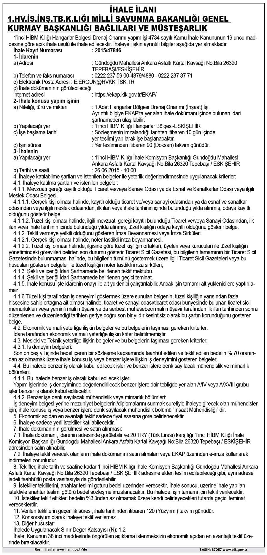 İHALE İLANI 1. HV.S.İNŞ.TB.K.LIĞI MİLLİ SAVUNMA BAKANLIĞI...