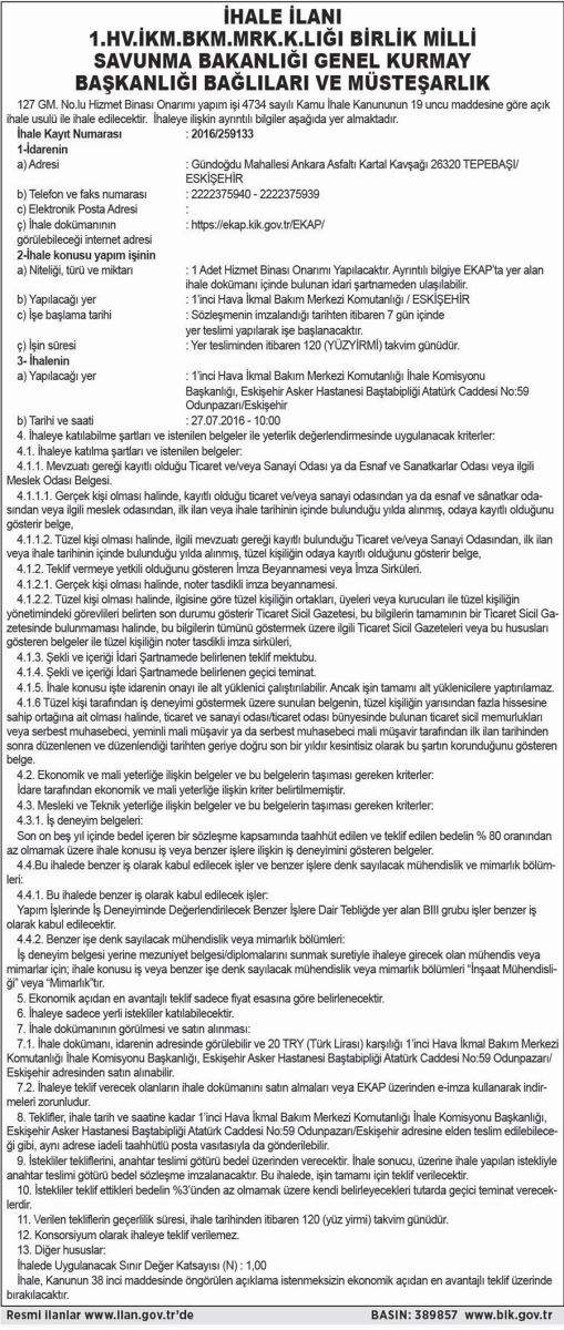 İHALE İLANI 1.HV.İKM.BKM.MRK.K.LIĞI