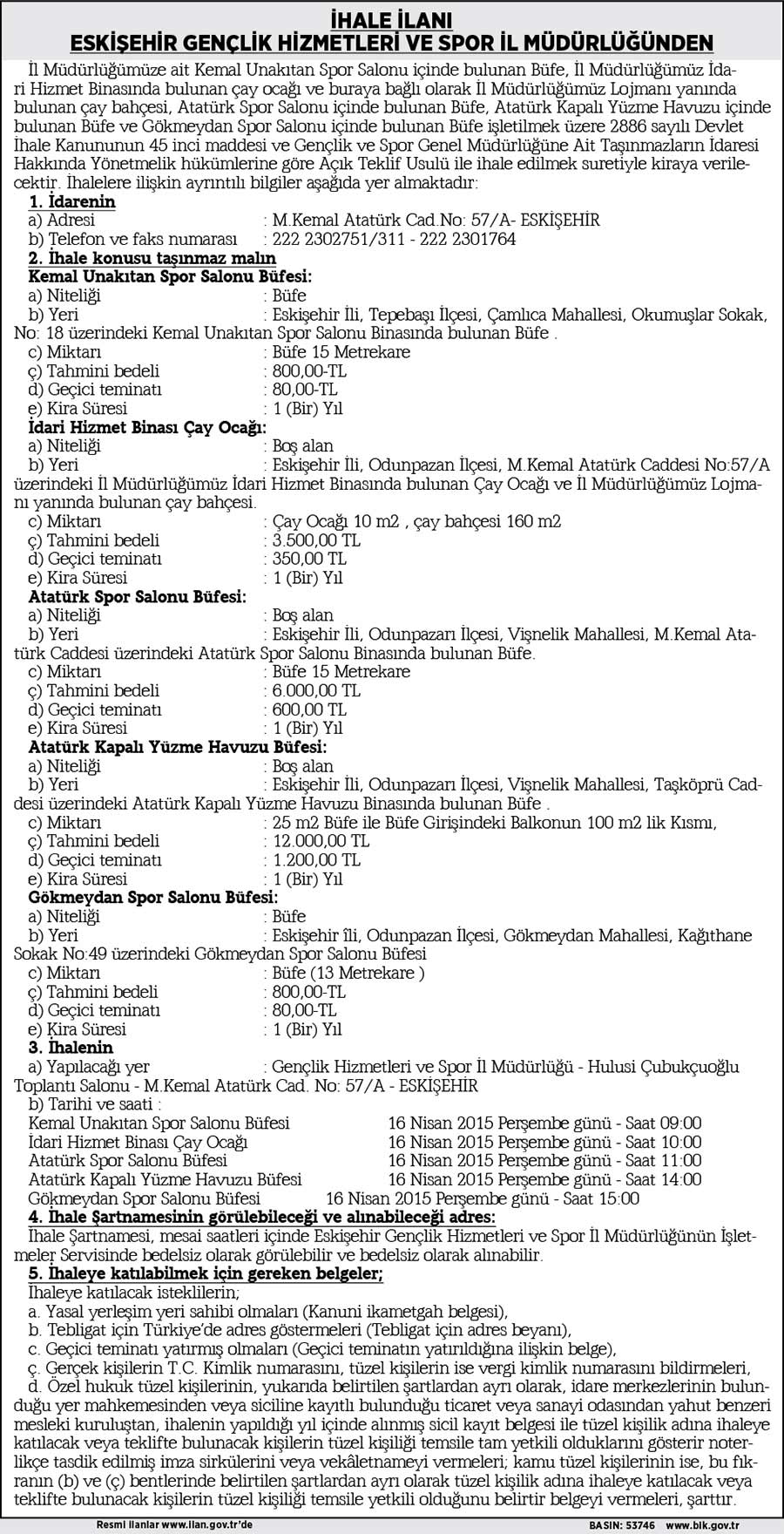İHALE İLANI ESKİŞEHİR GENÇLİK HİZMETLERİ VE SPOR İL MÜDÜRLÜĞÜ
