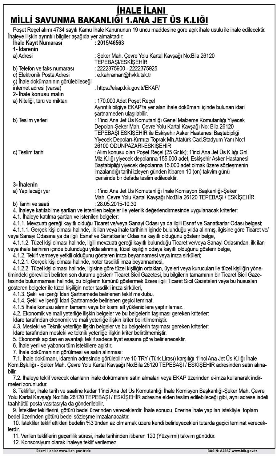 İHALE İLANI MİLLİ SAVUNMA BAKANLIĞI 1. ANA JET ÜS. K.LIĞI
