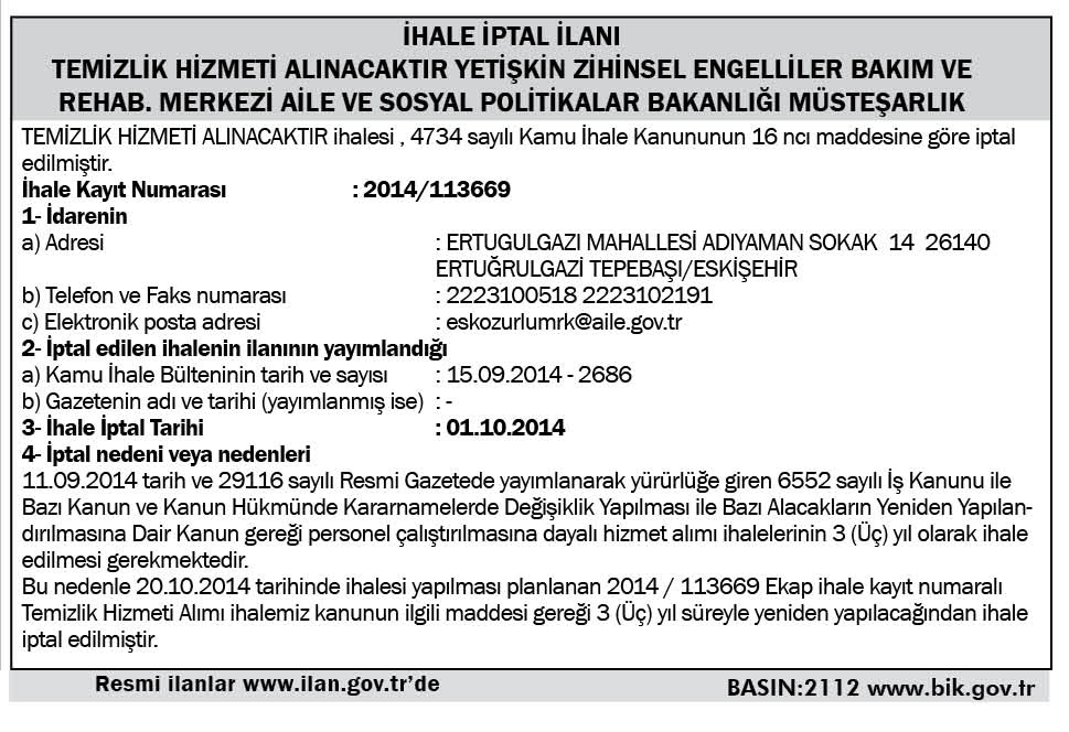 İHALE İPTAL İLANI