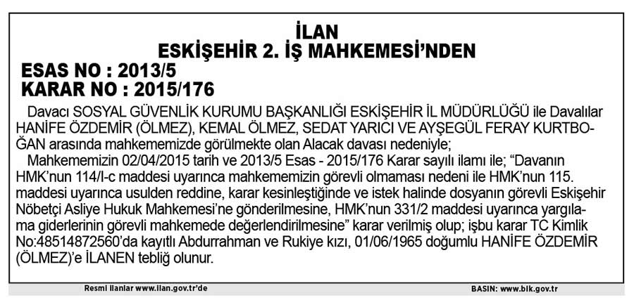 İLAN ESKİŞEHİR 2. İŞ MAHKEMESİ'NDEN