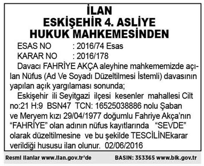 İLAN ESKİŞEHİR 4. ASLİYE HUKUK MAHKEMESİ