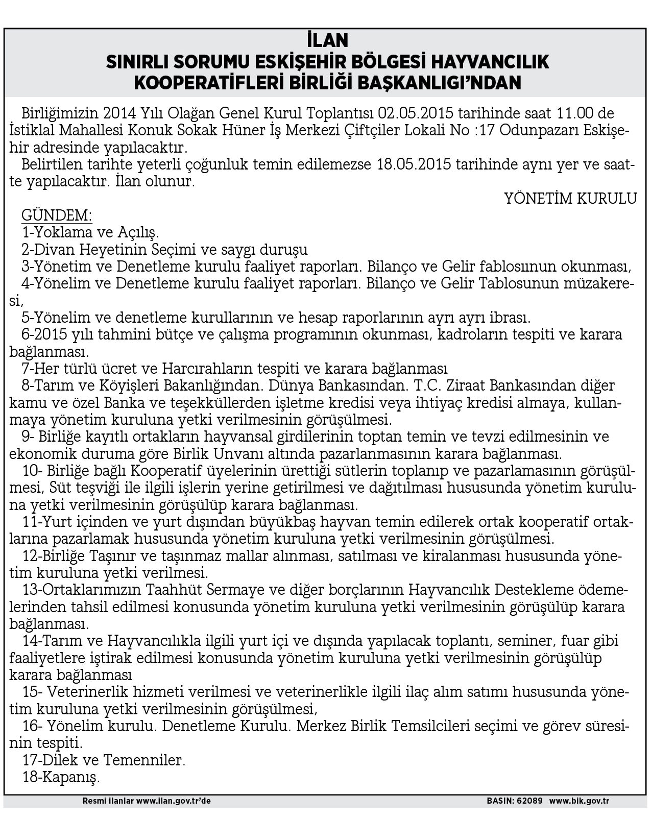 İLAN SINIRLI SORUMLU ESKİŞEHİR BÖLGESİ HAYVANCILIK