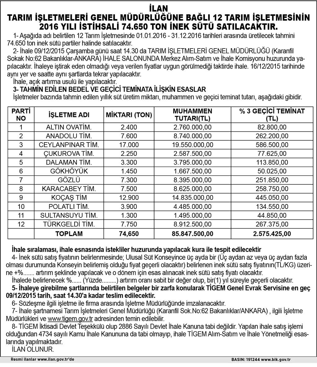 İNEK SÜTÜ SATIN ALINACAKTIR - TARIM İŞLETMELERİ GENEL MÜDÜRLÜĞÜ