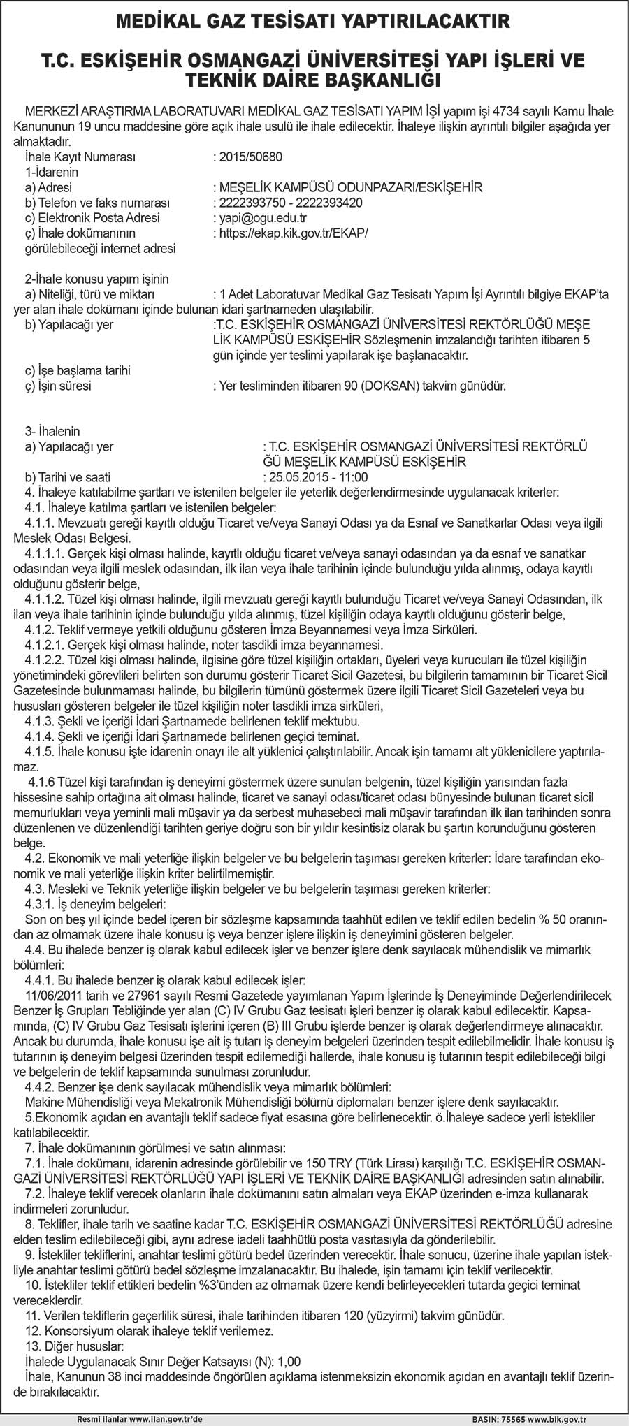 MEDİKAL GAZ TESİSATI YAPTIRILACAKTIR