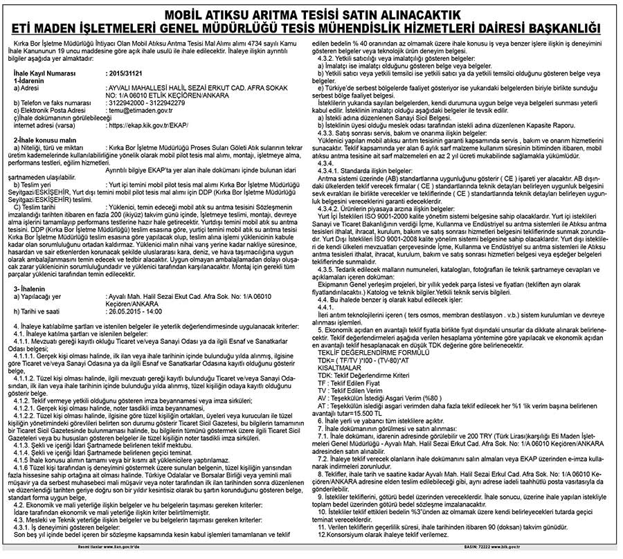 MOBİL ATIKSU ARITMA TESİSİ SATIN ALINACAKTIR