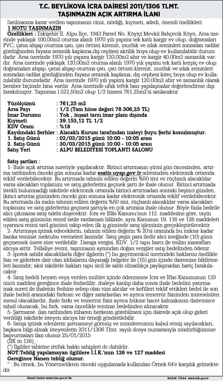 T.C. BEYLİKOVA İCRA DAİRESİ 2011/1306 TLMT.