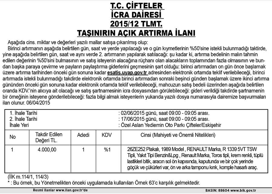 T.C. ÇİFTÇİLER İCRA DAİRESİ 2015/1 2TLMT.