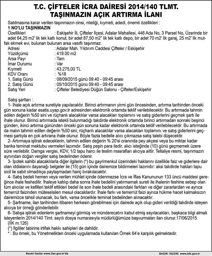 T.C. ÇİFTELER İCRA DAİRESİ 2014/140 TLMT.