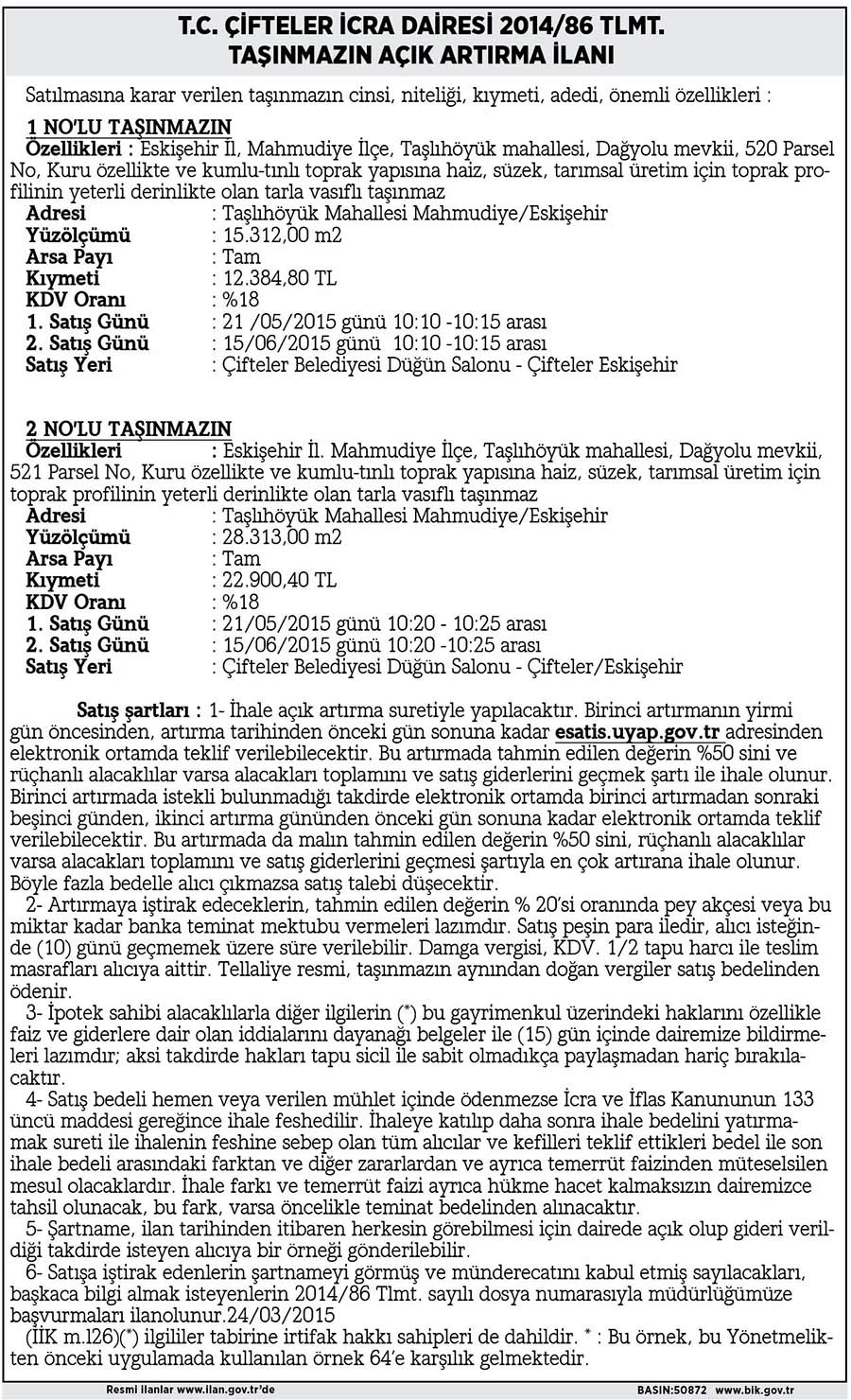 T.C. ÇİFTELER İCRA DAİRESİ 2014/86 TLMT.