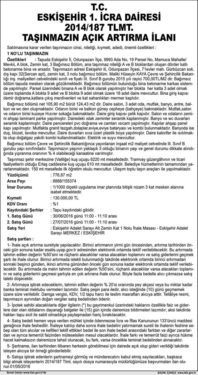 T.C. ESKİŞEHİR 1. İCRA DAİRESİ 5 Mayıs 2016