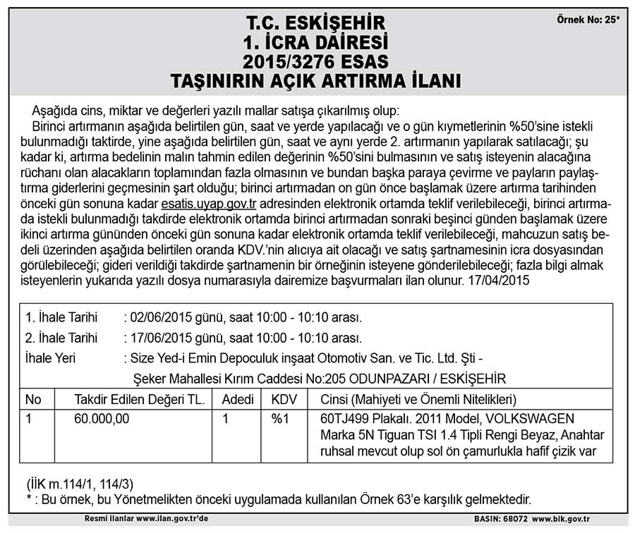 T.C. ESKİŞEHİR 1. İCRA DAİRESİ 2015/3276 ESAS