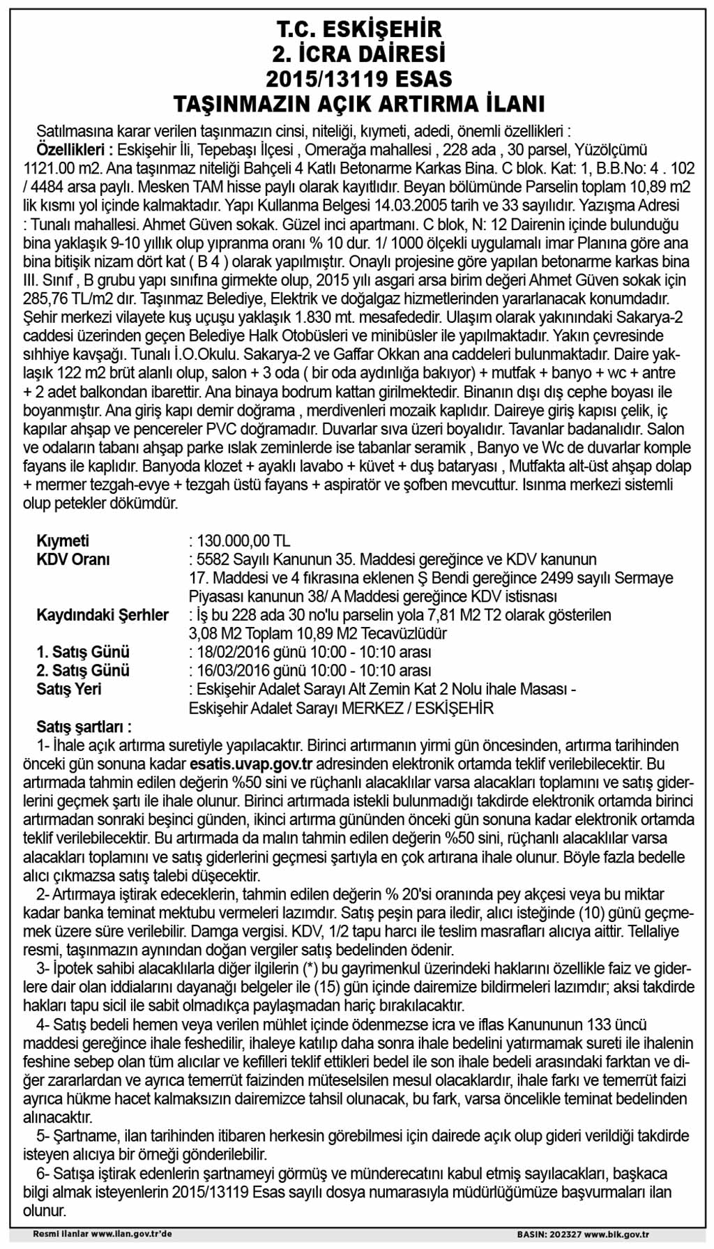 T.C. ESKİŞEHİR 2 İCRA DAİRESİ - AÇIK ARTIRMA İLANI