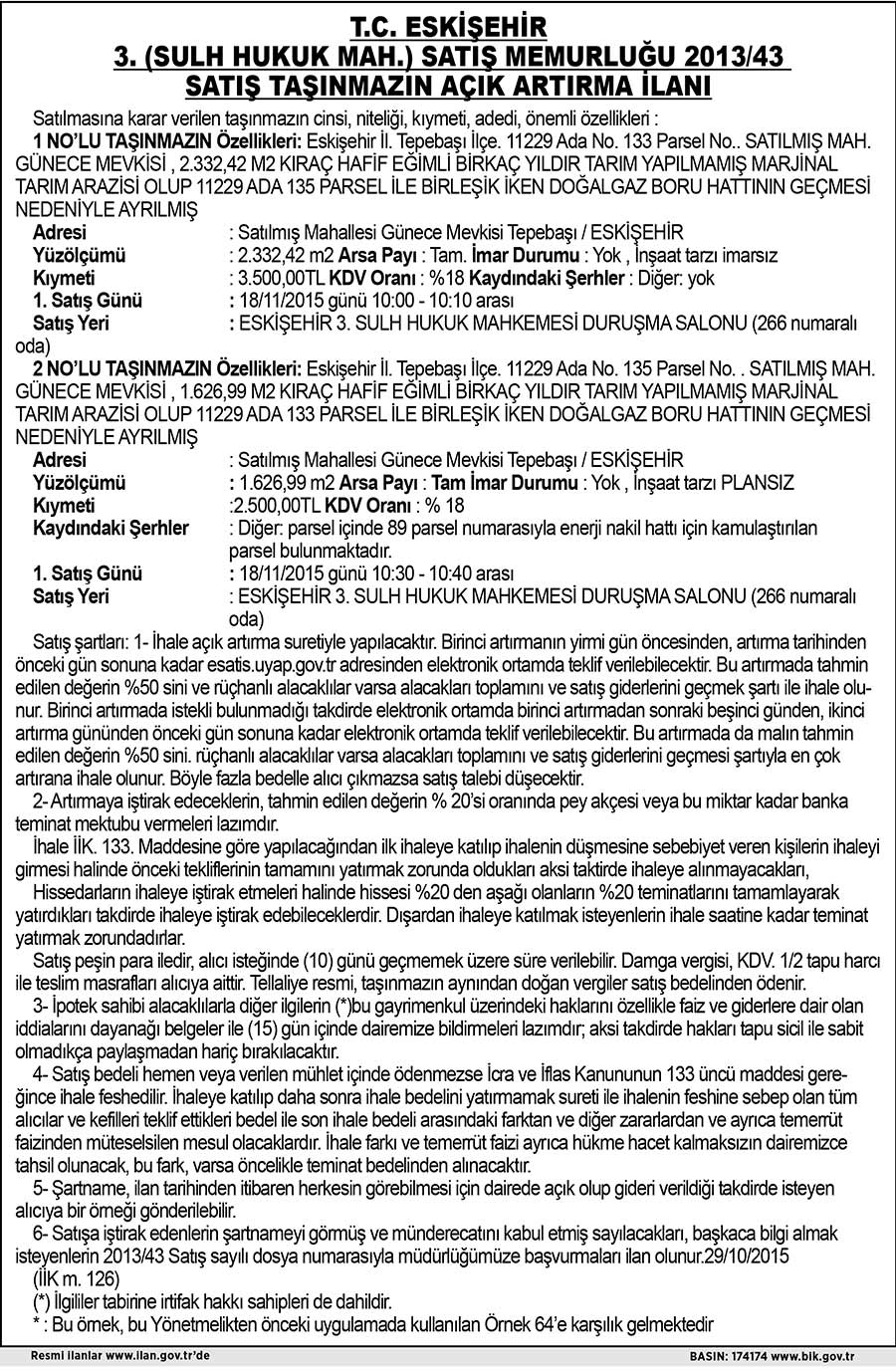 T.C. ESKİŞEHİR 3. SULH HUKUK MAH. SATIŞ MEMURLUĞU