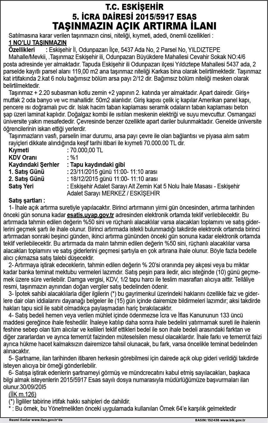 T.C. ESKİŞEHİR 5. İCRA DAİRESİ 2015/5917 ESAS