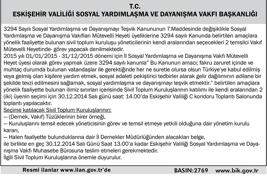 T.C. ESKİŞEHİR VALİLİĞİ SOSYAL YARDIMLAŞMA VE DAYANIŞMA VAKFI BAŞKANLIĞI