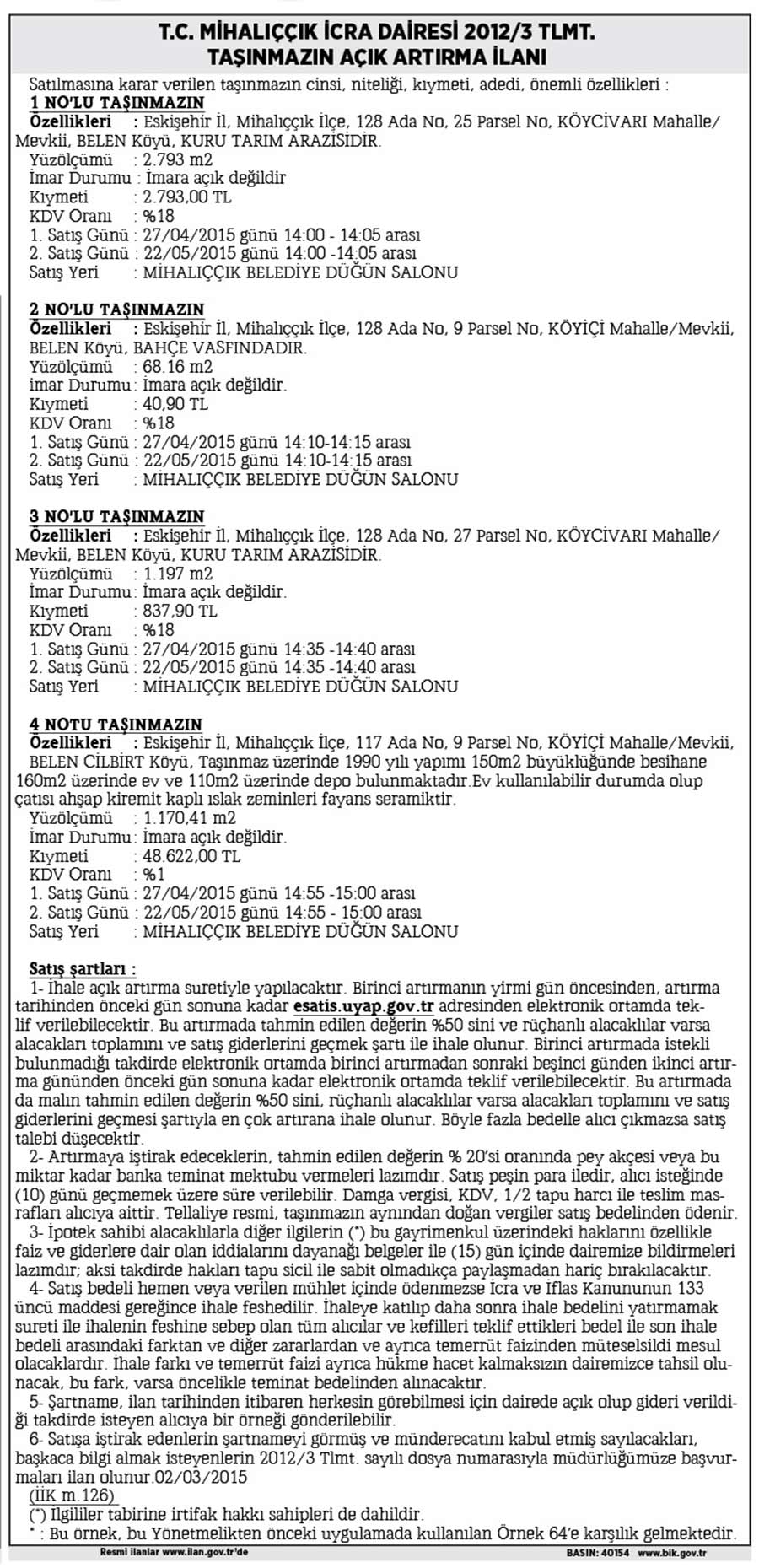 T.C. MİHALIÇÇIK İCRA DAİRESİ 2012/3 TLMT.