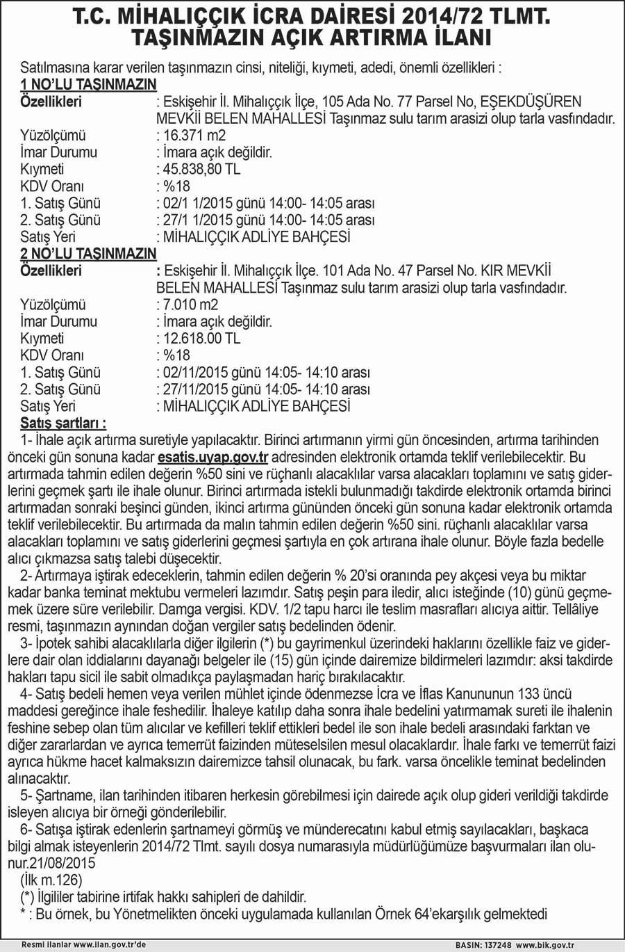 T.C. MİHALIÇCIK İCRA DAİRESİ 2014/72 TLMT.