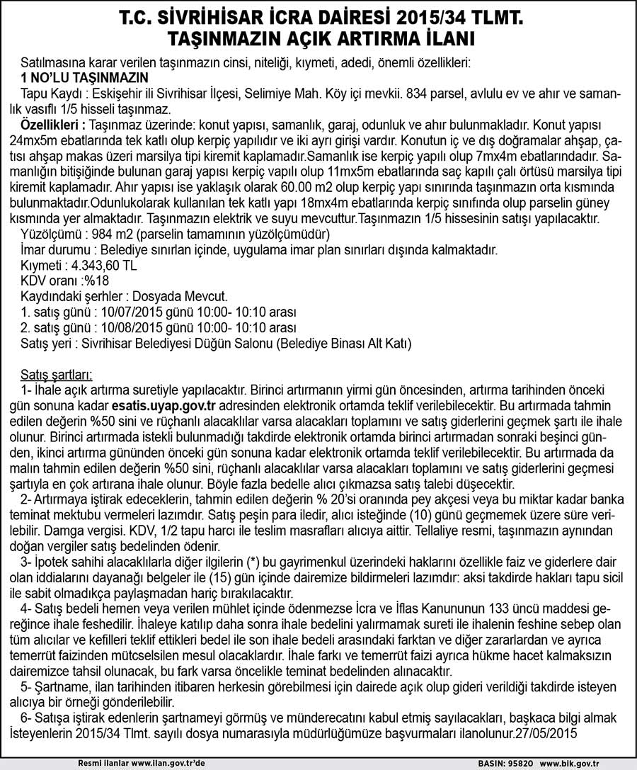 T.C. SİVRİHİSAR İCRA DAİRESİ 2015/34 TLMT.