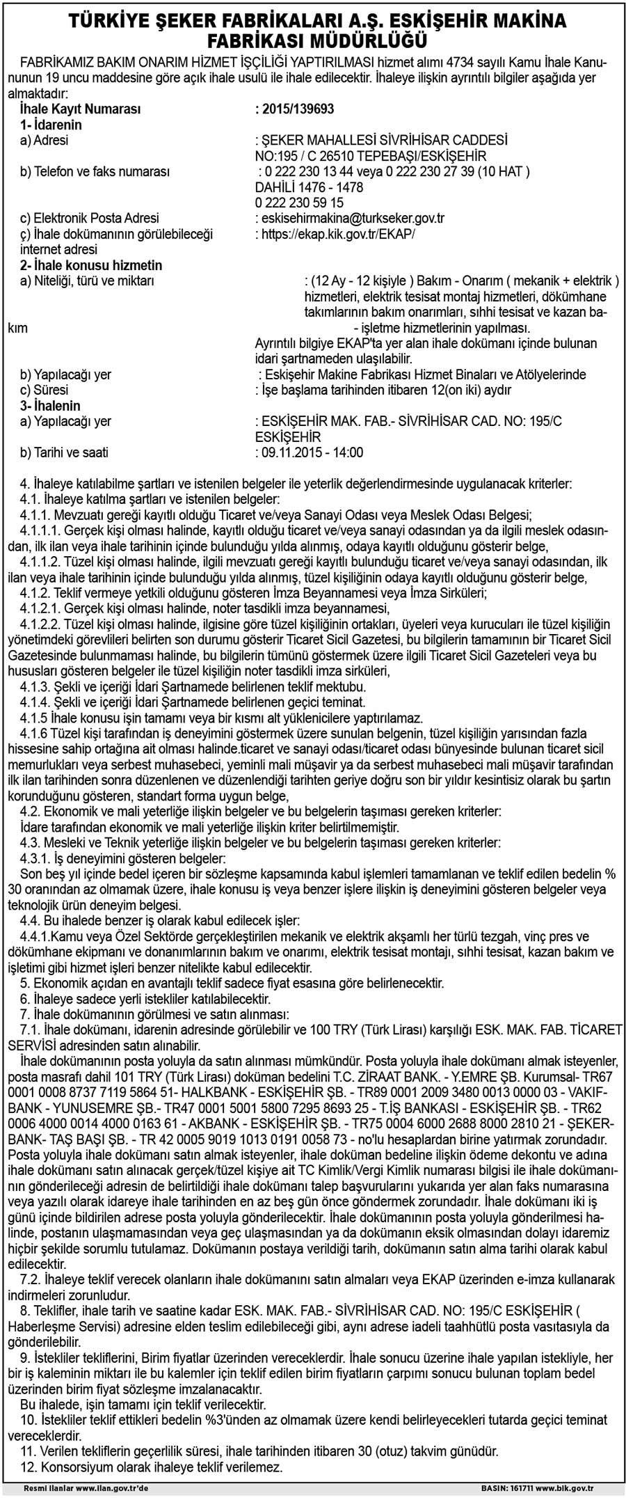TÜRKİYE ŞEKER FABRİKALARI A.Ş. ESKİŞEHİR MAKİNA FABRİKASI MÜDÜRLÜĞÜ