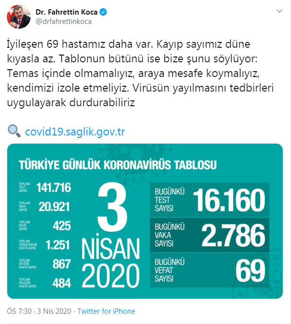 Fahrettin Koca resmi Twitter hesabından yaptığı paylaşımda "İyileşen 69 hastamız daha var. Kayıp sayımız düne kıyasla az. Tablonun bütünü ise bize şunu söylüyor: Temas içinde olmamalıyız, araya mesafe koymalıyız, kendimizi izole etmeliyiz. Virüsün yayılmasını tedbirleri uygulayarak durdurabiliriz" ifadelerine yer verdi.