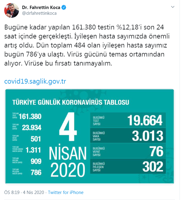 Sağlık Bakanı günlük verileri resmi Twitter hesabından da paylaştı. Koca paylaşımında, "Bugüne kadar yapılan 161.380 testin %12,18’i son 24 saat içinde gerçekleşti. İyileşen hasta sayımızda önemli artış oldu. Dün toplam 484 olan iyileşen hasta sayımız bugün 786’ya ulaştı. Virüs gücünü temas ortamından alıyor. Virüse bu fırsatı tanımayalım." ifadeleri kullandı.