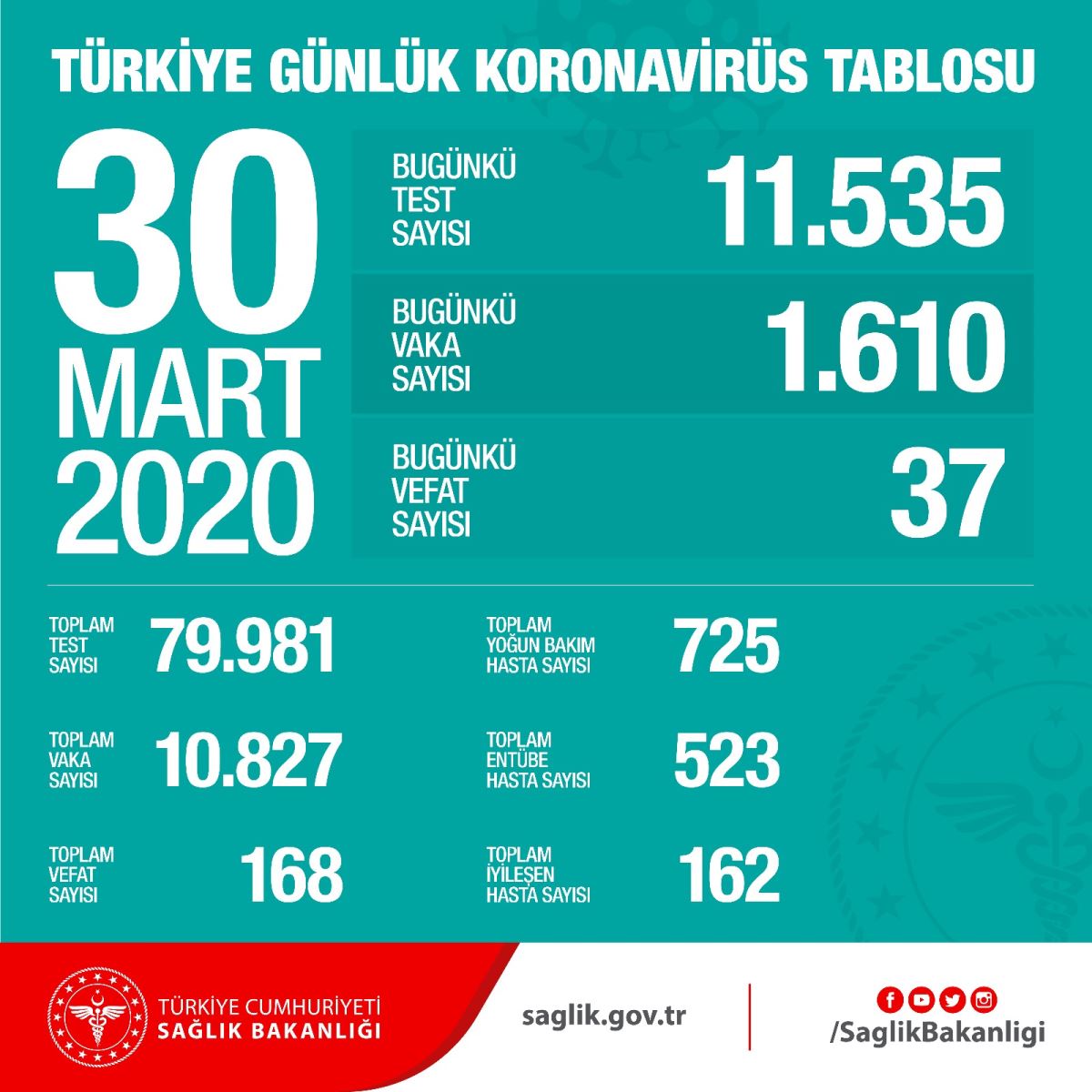 Türkiye Günlük Koronavirüs Tablosuna göre, son 24 saatte 1610 kişiye Covid-19 tanısı konuldu, 37 kişi hayatını kaybetti, vaka sayısı 10 bin 827'ye, can kaybı 168'e ulaştı.