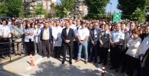 Yunus Emre Devlet Hastanesi’nde gerçekleşen etkinlikte konuşan Eskişehir Kamu Hastaneleri Birliği Genel Sekreteri Uzm. Dr. Hüseyin S.Fidan, ülkenin güçlü yarınlara daha sağlıklı bir toplum temelinde ulaşabilmesi adına 700 bin kişilik çalışanı olan ve bu amaçla için emek veren büyük bir ailenin mensupları olduklarını belirtti. Dr. Fidan, “Son günlerde manidar bir şekilde gündem oluşturan ve maalesef değerli meslektaşımız Op. Dr. Kamil Furtun’un görevi başında vahşice katledilmesi ve ilimizde sağlık çalışanlarımıza yönelik yapılan saldırılarla farklı bir boyut kazanan “Sağlık ve Şiddet” kelimelerinin sıkça yan yana anılıyor olmasından evlatlarınız olarak derin bir endişe ve üzüntü duymaktayız. Bizlere güvendiniz, okuttunuz, büyüttünüz ve sağlığınızı emanet ettiniz. Bizler de bu emanete en iyi şekilde sahip çıkabilmek, sizlerin güvenini ve emeğini boşa çıkarmamak adına gece gündüz demeden çalışıyor, ter döküyoruz. Sizlere geçmiş yıllarla mukayese edilemeyecek nitelikte, gelişen tıp teknolojilerinin en iyi ürünleriyle donatılmış sağlık tesislerimizde hizmet vermekteyiz. Ülkemizi sağlık alanında çağ atlatan ve dünyada zirve yarışına taşıyan bu büyük başarı, sizlerin desteği olmadan hizmet sunumunda tek başına yeterli olamayacaktır. Şifa sunan ellerin sahipleri, her gün yastığa başını koyarken sağlığınız için aldığı kararları şöyle bir gözden geçirip, vicdanını rahatlatmadan gözlerini kapayamıyor, bundan emin olunuz. Ne var ki, üst üste yaşanan olaylar sizlerin evlatları olan sağlık çalışanlarımızın moral ve motivasyonunu neredeyse tükenme noktasına getirmiş durumdadır. Biz sizlerin sayesinde varız, sizlerin duaları ve desteğiyle ayaktayız. Mesleğimizi icra ederken kin, nefret ve şiddetin diliyle karşımıza çıkanlara en büyük dersi ancak ve ancak hep birlikte verebiliriz. Unutmayalım ki, insan hayatını hiçe sayacak kadar vahşileşen bu çirkin durumun sadece yasal düzenlemelerle sıfır noktasına getirilmesi beklenemez. Bu nedenledir ki; Şifa veren eller, sizlerden kendilerini anlayan yürekler istiyor. Şiddeti ve vahşeti reva gören canavarlar kadar, yaşanan şiddet olayları üzerinden hesap yapıp, insani duyguları istismar edenlere karşı da tüm halkımızı ve sağlık çalışanlarımızı dikkatli olmaya çağırıyoruz” diye belirtti.