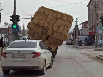 Afyonkarahisar’Da Saman Balyası Yükle Bir Kamyonet Adeta Kazaya Davetiye Çıkarırcasına Trafikte İlerledi. Yürükleri Ağza Getiren Görüntülerde Saman Yüklü Kamyonetin Sürücülerin Hayatını Hiçe Saydığı Görüldü.