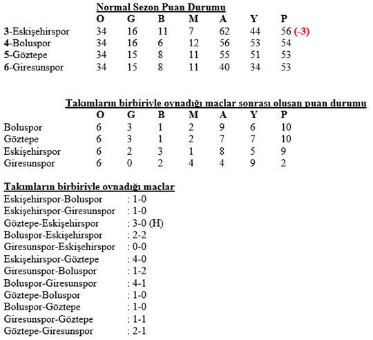 Eskişehirspor, Boluspor, Göztepe ve Giresunspor’un yer aldığı Play-Off’ta çarpıcı istatistikler ön plana çıkıyor. 4 takımın ligde birbiri ile oynadığı maçlarda alınan skorlardan oluşturulan puan durumunda zirvede 10 puanla Boluspor yer alıyor. Aynı puanlı Göztepe averajla 2’nci. 9 puanlı Es Es 3’üncü olurken, 2 puanı bulunan Giresunspor son sırada bulunuyor.