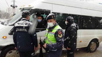 Yoğun kar yağışı nedeniyle sürücülerin takip mesafesine uymaları ve kış lastiği kullanmaları konusunda uyarılarda bulunan ekipler, eksik evraklı araç sürücülerine de cezai işlem uyguladı.