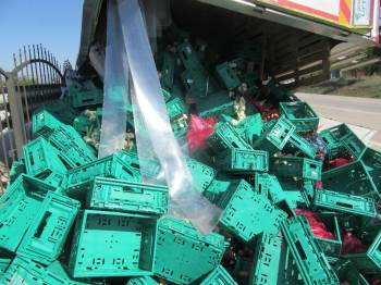 Çekici ile devrilen kamyonun kaldırılmasının ardından yola saçılan meyve ve sebzeler temizlendi.