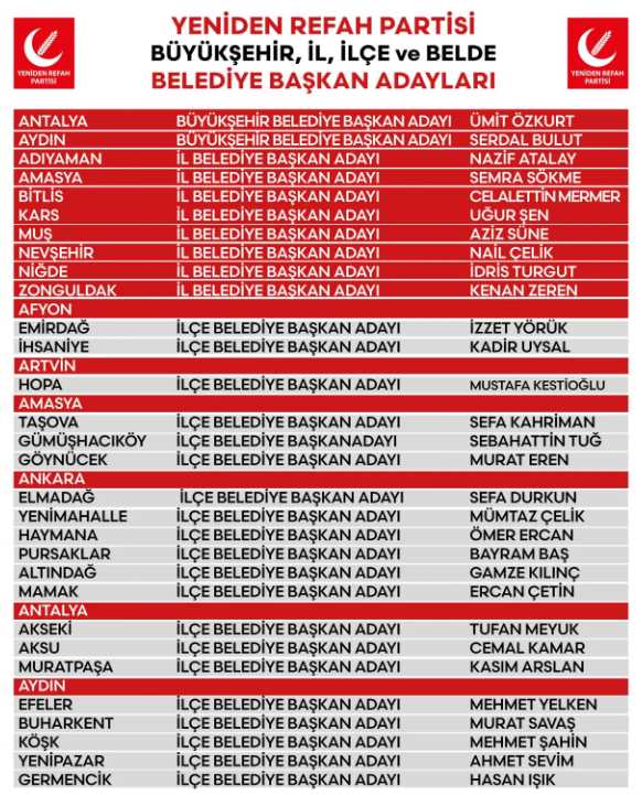 İstanbul ve Ankara adaylarını 10 Şubat Cumartesi günü açıklayacak Yeniden Refah Partisi’nin Antalya Büyükşehir Belediye Başkan adayı Ümit Özkurt, Aydın Büyükşehir adayı ise Serdal Bulut oldu.