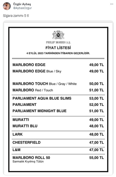 Türkiye Tekel Bayileri Platform Başkanı Özgür Aybaş tarafından açıklanan bilgilere göre, bugünden itibaren geçerli olmak üzere Philip Morris markasına ait sigara grubuna 5 TL zam yapıldı.