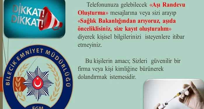Bilecik İl Emniyet Müdürlüğünden yapılan açıklamada, "Telefonunuza gelebilecek ’Aşı randevu oluşturma’ mesajları veya sizi arayarak, ’Sağlık bakanlığından arıyoruz, aşıda önceliklisiniz, size kayıt oluşturalım’ diyerek kişisel bilgilerinizi isteyenlere itibar etmeyiniz. Bu kişilerin amacı sizleri güvenir bir firma veya kişi kimliğine bürünerek, dolandırmak istemesidir" denildi.
