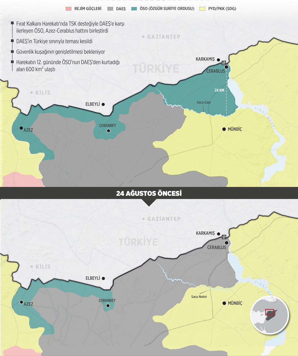 Azez-Cerablus hattı birleştirildi, IŞİD Türkiye sınırından temizlendi.
