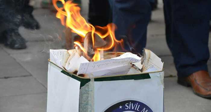 Açıklamanın ardından eyleme katılan sendika üyeleri, maaş bordrolarını ateşe vererek eylemlerini sonlandırdı.