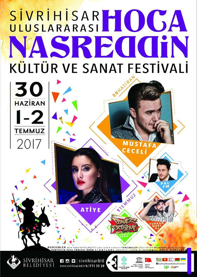 Nasreddin Hoca Kültür ve Sanat Festivali’nin duyurusu için Sivrihisar Belediye’si tarafından hazırlanan afişte ünlü sanatçılar Mustafa Ceceli ve Atiye’nin de konserleri yer alıyor.