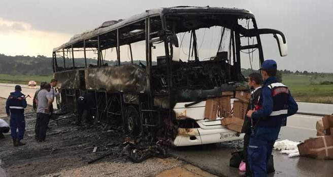 Kütahya'da bir yolcu otobüsü seyir halindeyken alev alarak yanmaya başladı. Otobüsteki yolcuları tahliye eden şoförün dikkati olası bir faciayı önledi.